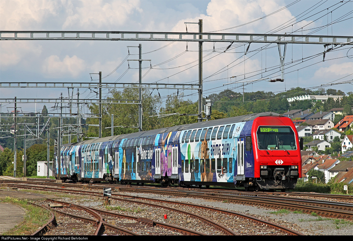 | Since march 2019 this double deck commuter trainset (DPZ) of the S-Bahn Zürich has a a new publicity paint scheme "Zäme Züri" (Zurich together). The train is running the S12 service Schaffhausen - Brugg. |