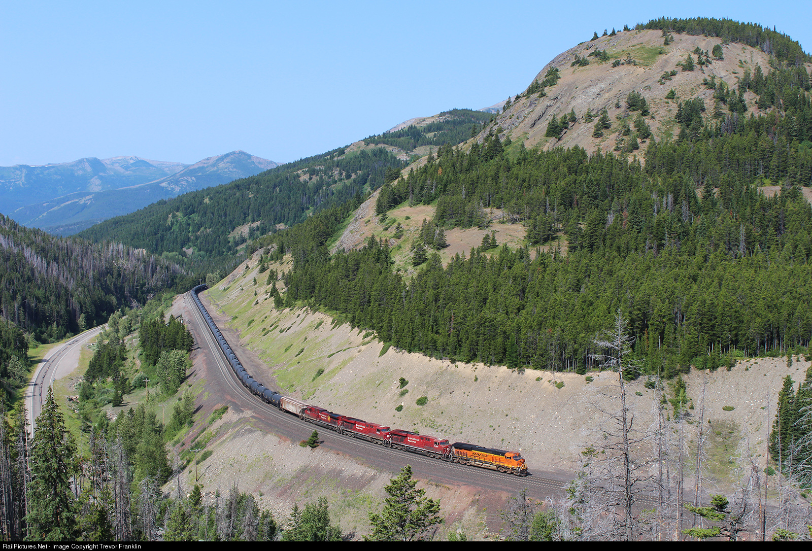 BNSF 5535 and three Canadian visitors are working hard in their final push to the summit of Marias Pass nearing the continental divide (5,216' here) and the Eastern border of Glacier National Park. It's a tough hike through quite a bit of deadwood, but the vantage points from both directions are top-notch and so is the weather on this morning.