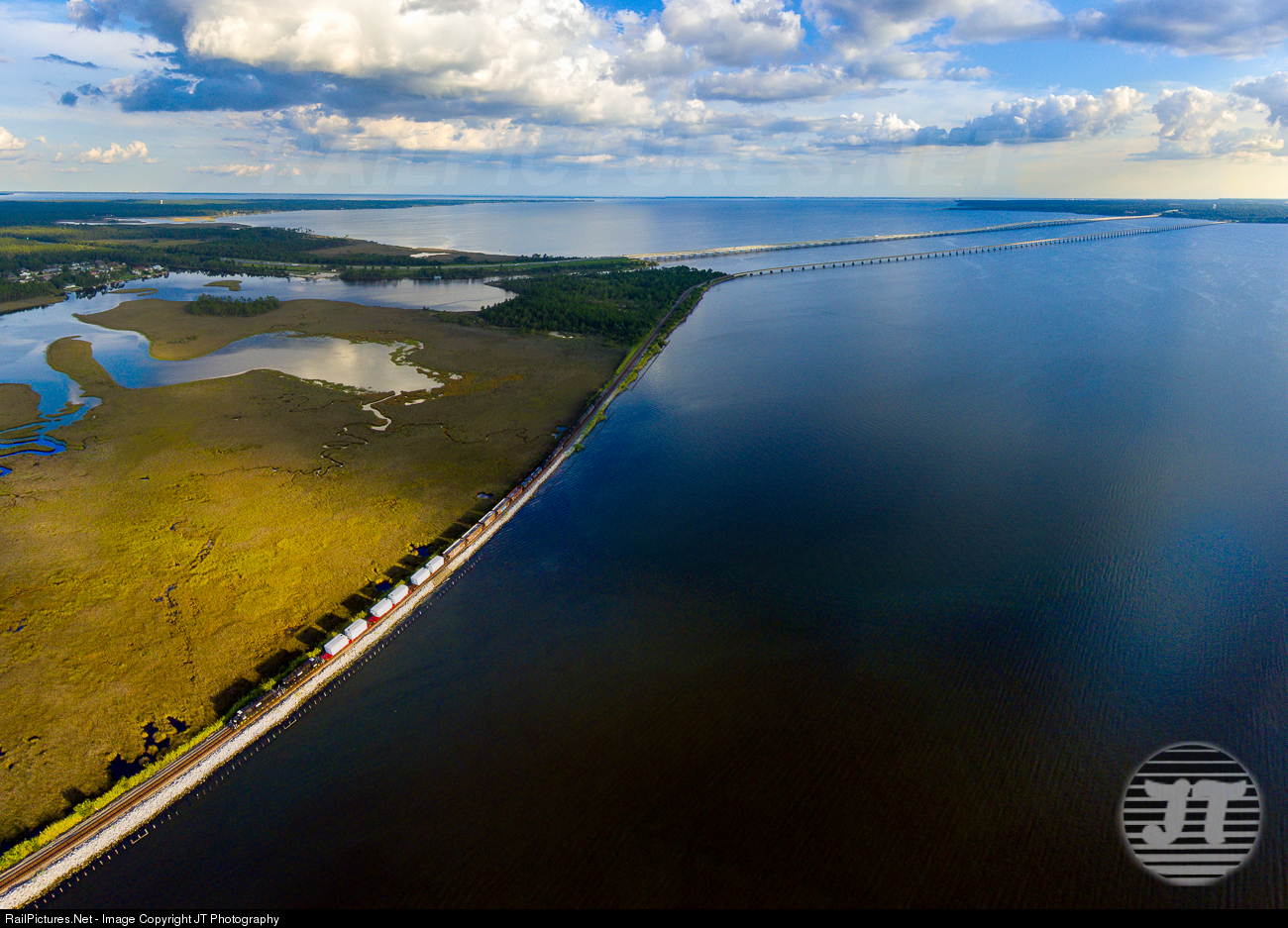 The Break in the Clouds. The sun is setting as FURX 7156 skirts the brackish waters of Escambia Bay on its way east with three flatcars of GE Generators it just picked up from the GE Plant in Pensacola along with a cut of cars from Goulding Yard. The John T. Collinson Bridge can be seen in the background. I initially thought this would be a cloudy picture, but a last minute break in the clouds left me scrambling to maneuver the drone into it.