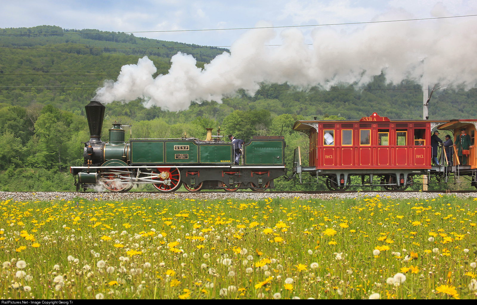The oldest operational steamlocomotive of Switzerland is the 0-4-6 T Ec 2/5 # 28 "GENF", which was built in 1858 by Emil Kessler in Esslingen/Germany for the Schweizerische Centralbahn (SCB)m mainly for the line Olten-Hauenstein (Läufelfingen)-Sissach. This interesting loco is of the Engerth design, so the tender is articulated with the main locomotive frame, allowing some of the weight of the fuel and water to be carried on the driving wheels to improve adhesion. Because the tender was articulated, rather than directly attached to the frame, the locomotive could traverse relatively sharp curves, while still enjoying the advantage of the additional adhesive weight gain. Usually, the locomotive is exhibited in the Swiss Museum of Transport in Lucerne, but in 2009 she was out on the line several times. The locomotive is on the way from Olten to Biel on the Jura mountain range south foot line near Oensingen, with the cars of the "Spanisch Brötli Bahn", replicas of the first swiss railway between Zürich and Baden in 1847. Locomotive and cars are hand braked only, no air brake and no contemporary buffers and couplings!