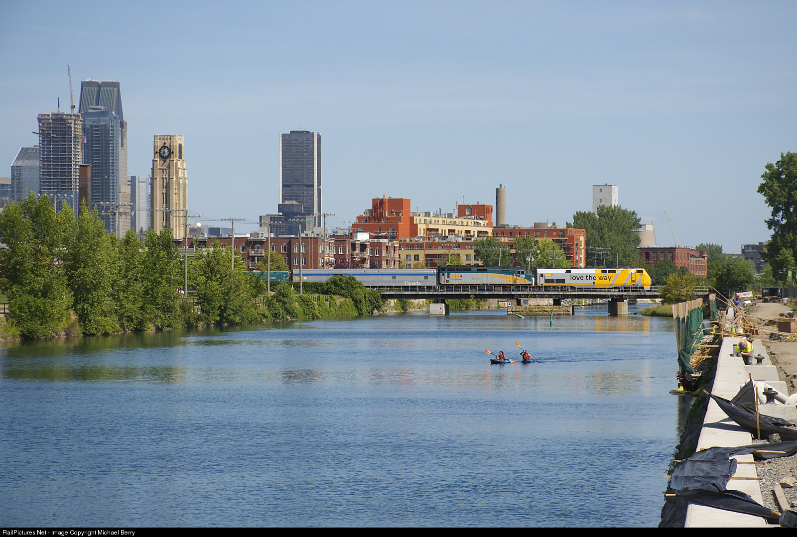 VIA 24 has VIA 920 (in 'love the way' wrap) and VIA 6438 for power as it crosses the Lachine Canal as a pair of kayakers head west on the canal. At right work continues on rebuilding the southern retaining wall.