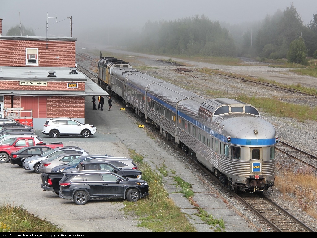 Special train from Senneterre to Amos is ready to depart, in the morning fog, and for the occasion, a dome observation car was brought from Montreal. There are 3 such trains during this summer, That line has not seen regular passenger service for more than 30 years