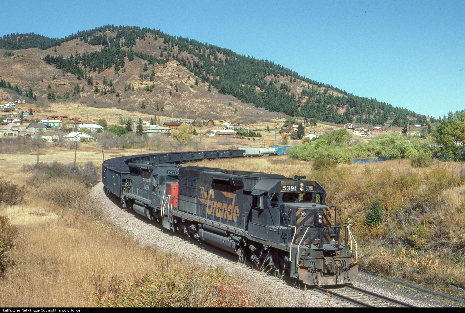 | DRGW 5391 leads Train # 165 at Palmer Lake, CO, Oct 22, 1983. Even small Palmer Lake has changed much since this image was taken. |