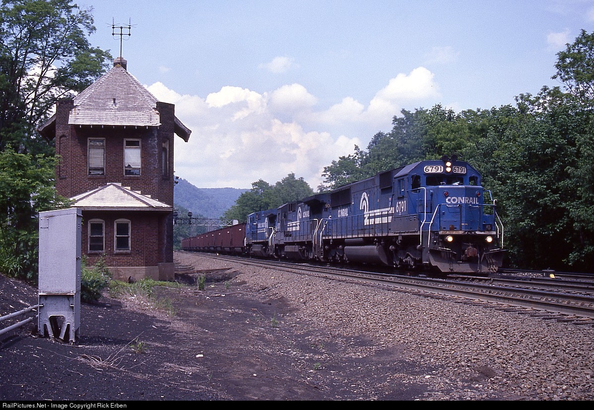 Somewhat of an oddball power assortment for a coal empty, SD50 6791 leads B40-8 5070 and Dash8-40CW 6144 past MG. Even with its tattered window shades, the still part-time open office at MG, just a mile and a half west of Horseshoe Curve, looked much better than it subsequently appears with the windows filled in with concrete after dispatchers assumed control of this interlocking. MG was an example of the solid brick construction PRR used with its interlocking stations during the 30s and 40s, indicative of the significance the system placed upon these locations' critical function.