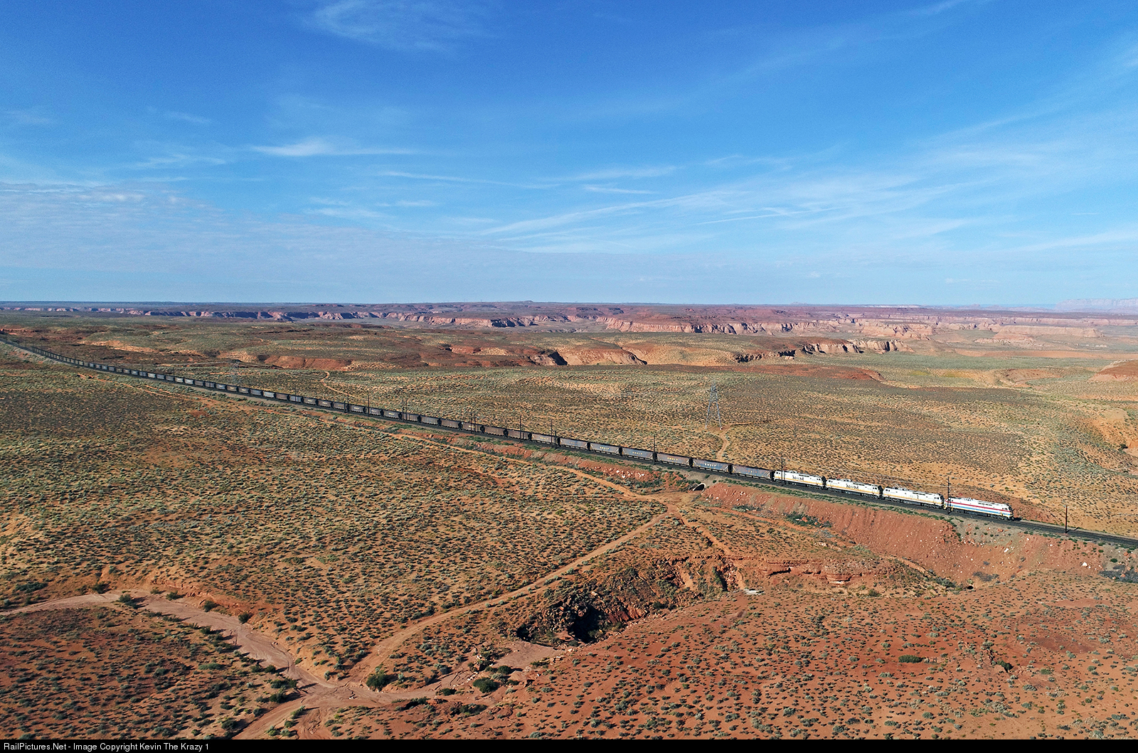 With Upper Antelope Slot Canyon in the background, a loaded Black Mesa & Lake Powell coal train is seen approaching the Navajo Generating Station in Page, AZ.