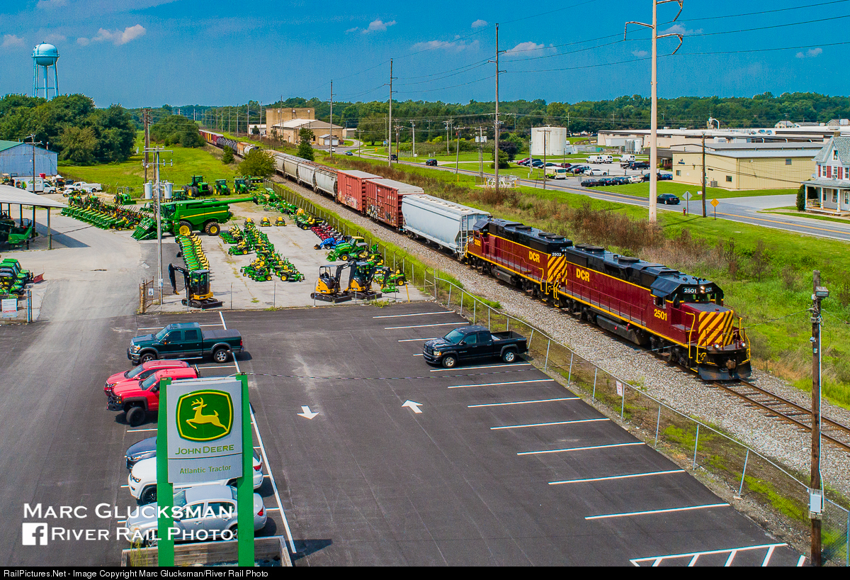 | DE in DE. Having just swapped trains with Norfolk Southern Corp K64, Delmarva Central Railroad train DCR-1 (2501, GP38-2, neƩ Conrail 8240) is seen passing the John Deere Dealership (abbreviated DE on the NYSE) in Clayton, DE on August 17, 2018. The DCR operates on almost 200 miles of rail and has reinvigorated the freight business on the peninsula that is its namesake. |
