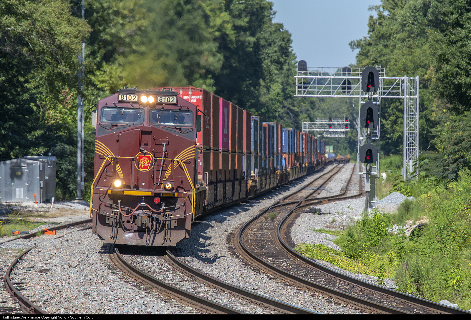Norfolk Southern's "Pennsylvania" heritage unit, ES44AC #8102, powers train 223 through Mableton, Georgia, nearing its destination of Inman Yard in Atlanta, with intermodal equipment from Kansas City. Photo by Casey Thomason. For more information about Norfolk Southern, visit www.nscorp.com