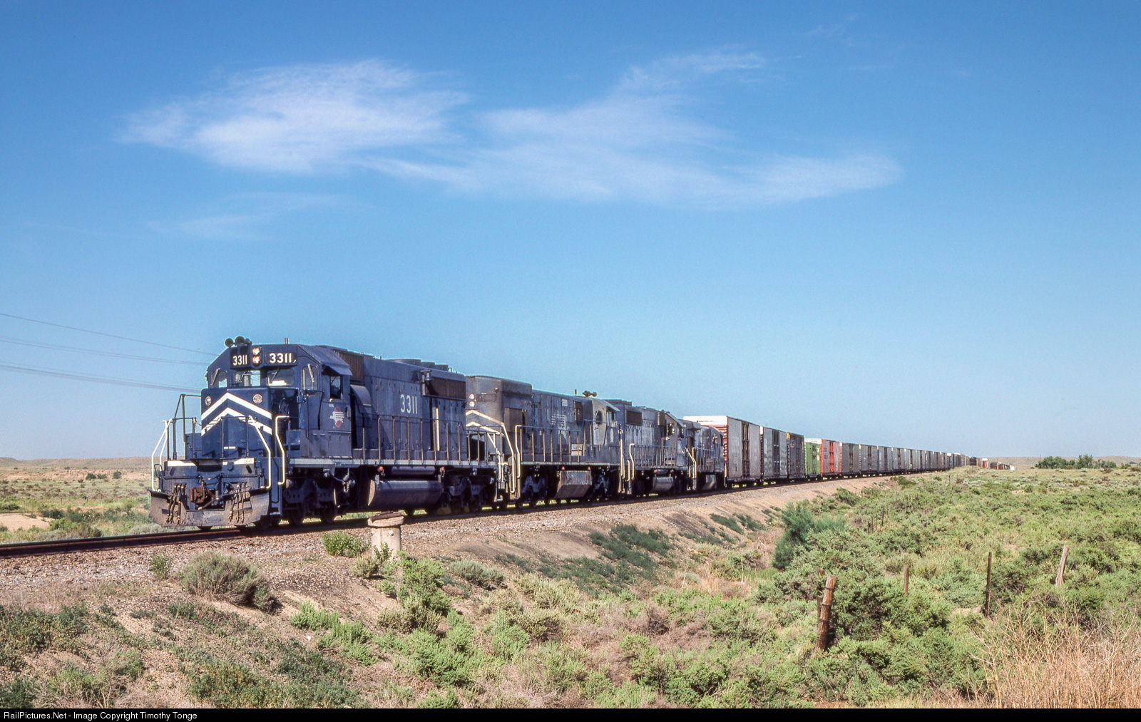 | MP 3311 leads the Ford Fast Train, one of the hottest rains on the MP, at NA Jct near Avondale, CO, on June 23, 1980. |