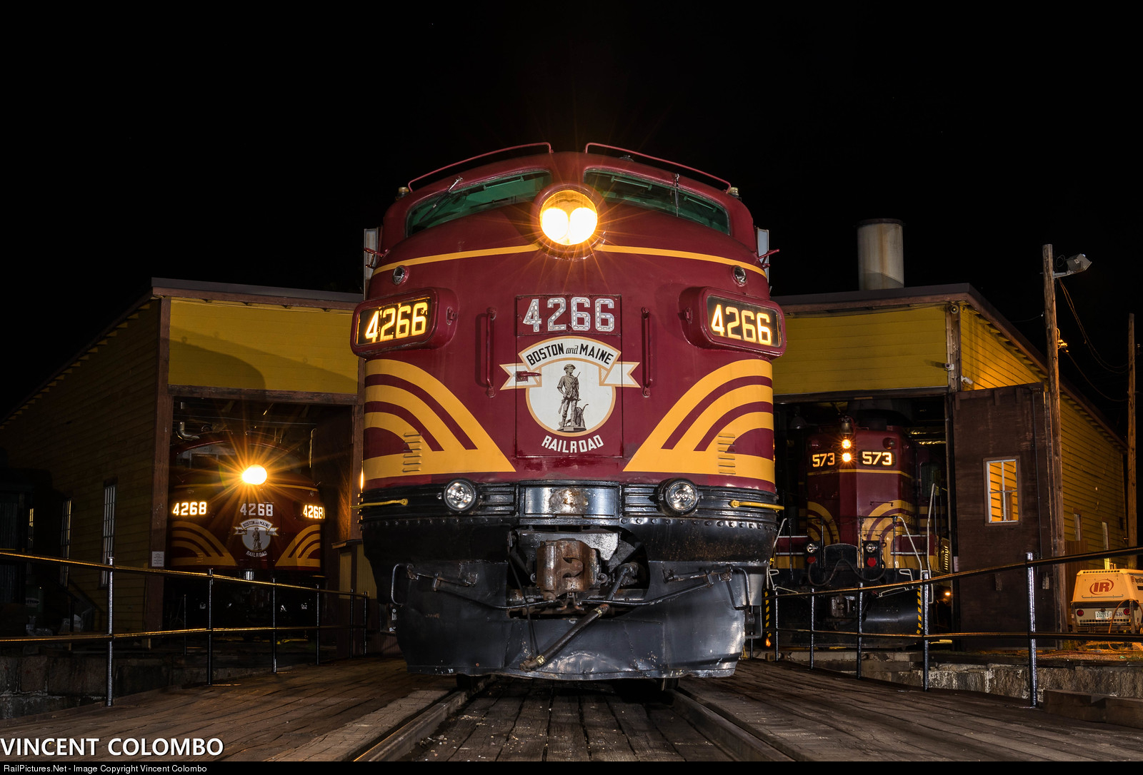 | Conway Scenic 4266 (ex-BM F7) is posed on the turntable at North Conway. In the stalls are 4268 (ex-BM F7) and 573 (ex-MEC GP7). 4268 has just received a fresh coat of paint and is set to be running in the near future. |