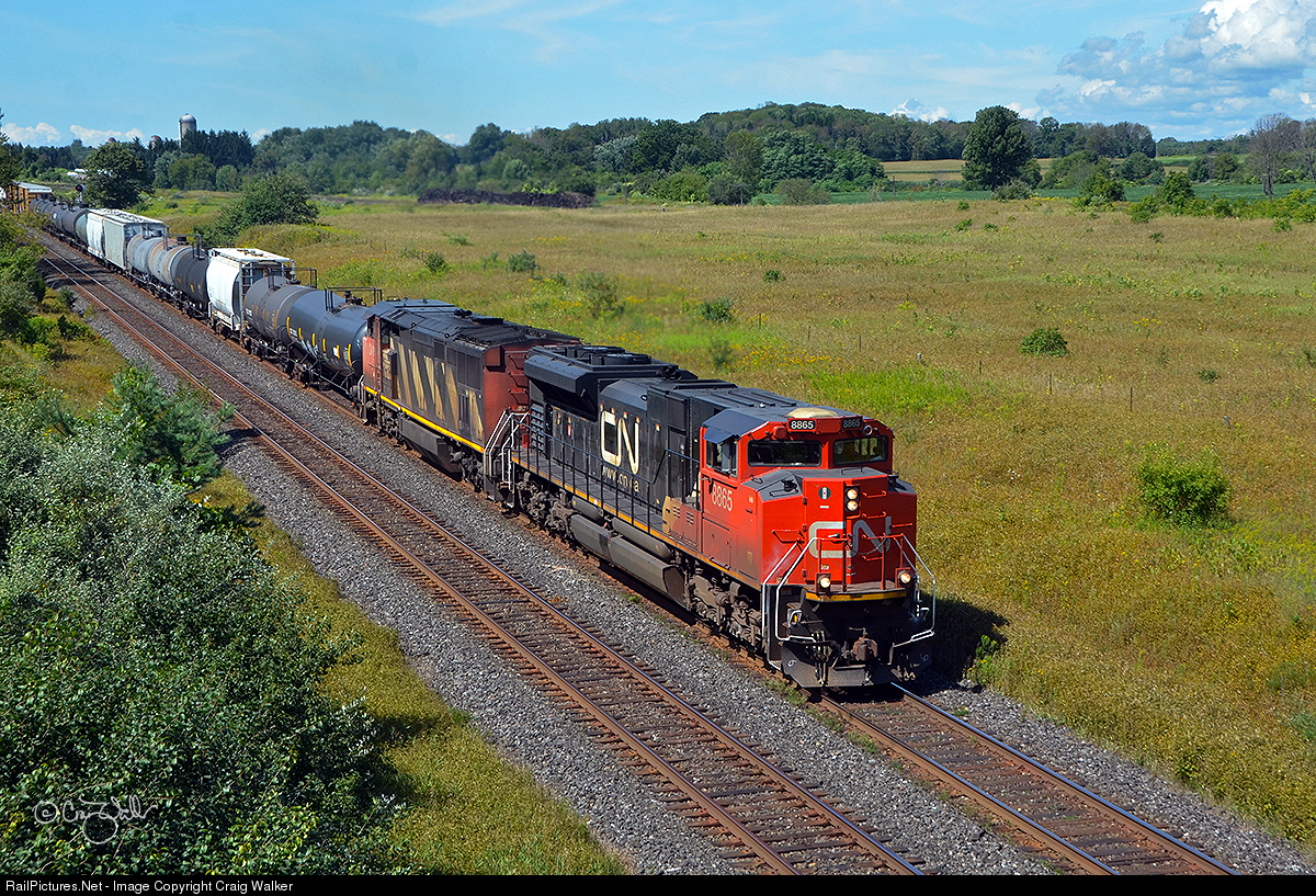 Not far from the shore of Lake Ontario, Canadian National train M37631 passes through bucolic Newtonville, Ontario, on a beautiful late summer day. Powered by CN SD70M-2 8865 and Dash 8-40CM 2419 (with mid-train unit Dash 8-40CW 2125 [the former Union Pacific 9090, originally Chicago & North Western 8549]), train 376 is heading from Toronto, Ontario's MacMillan Yard to Rivière-des-Prairies, Québec, with a load of merchandise. (August 25, 2019)