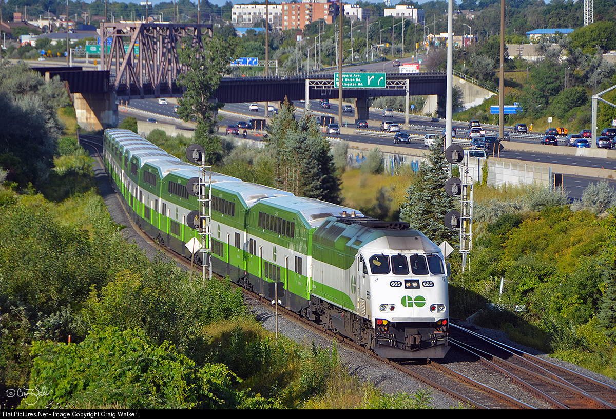 GO Transit train 9204, heading east from Toronto's Union Station to Oshawa, passes through Bayly as it slows for the stop in Pickering. GOT MP40PH-3C 665 is on the headend of twelve matching commuter cars, all in the "new" paint scheme, which was adopted in 2013 - although, six years later, not all the equipment has been repainted. The GO train is passing under Canadian National's York Sub, which diverges at Pickering Junction on the Kingston Sub (just to the left out of this photo) and crosses over both the GO Sub and the Ontario 401 Expressway by way of the through truss bridge in the distance, heading for CN's MacMillan Yard in Vaughn, a suburb of Toronto. (August 25, 2019)