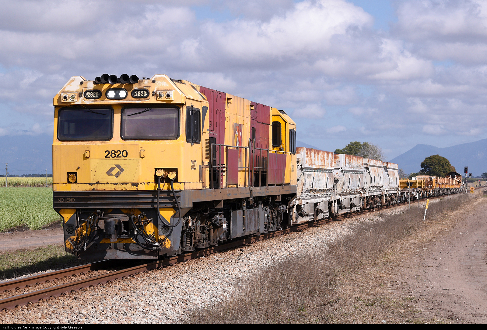 | The weekly 7752 Townsville to Acacia ridge sweeper trundles through Pioneer with 2820 leading, the final of her class in Bronco/QR Corporate livery. On the consist was 4 VBO ballast wagons 2 IORX railset wagons, and the Aurizon IRUY railset that was dropped off in Mackay. |