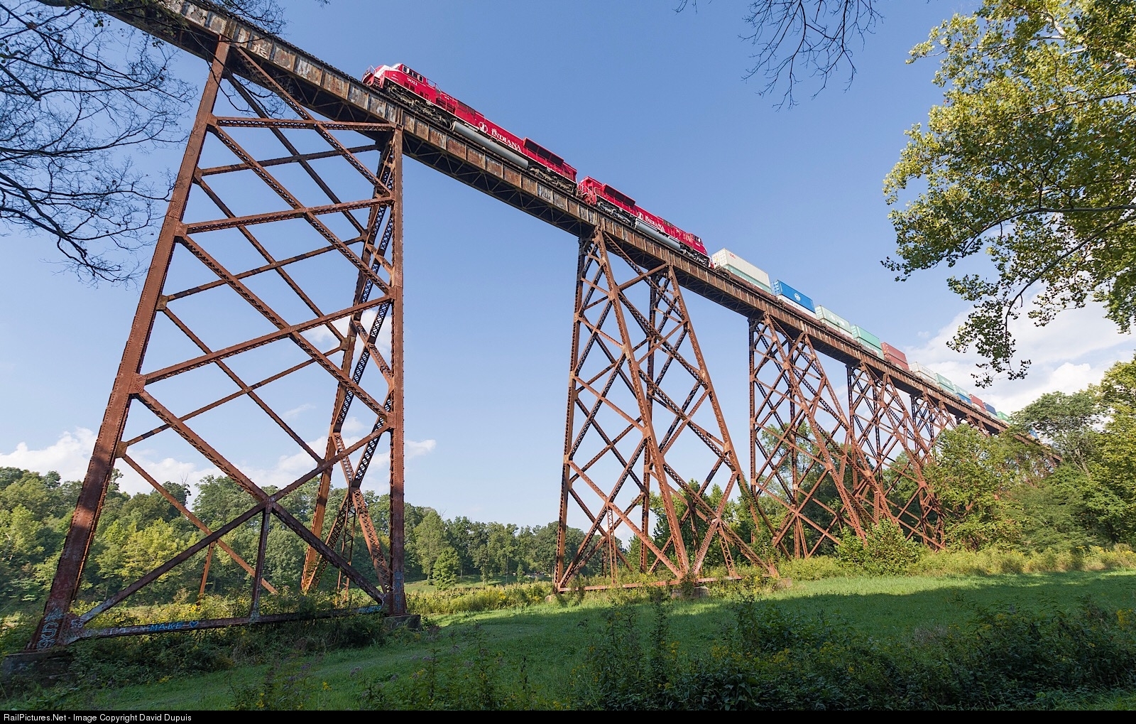 INRD 9011 and another SD90/43MAC take a westbound train over the monumental Tulip Trestle.