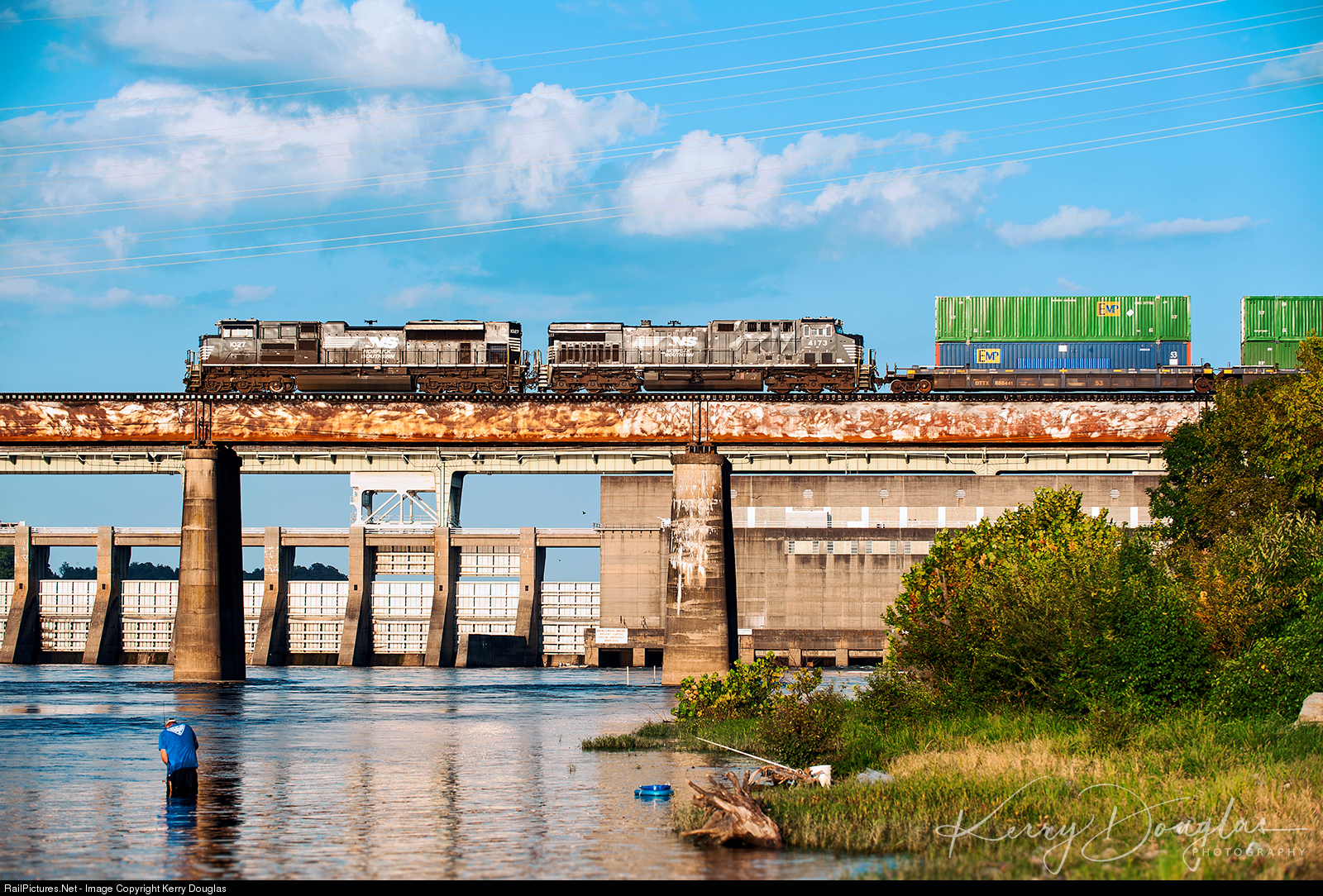 The locks are closed in the background at TVA’s Chickamauga Dam, the Tennessee River is just low enough to do some late evening Labor Day fishing. Northbound NS 282 (Jacksonville,FL-Chicago,IL) is creeping across the Tennessee River on the CNOTP South-End. NS 282 will stop short of Hamill Road to meet NS 229 instead of stopping at the Hixson control-point. This move only happens when trains extend the length to a point blocking that crossing. Once the meet is completed, CT-Dispatcher will notified NS 282 to proceed north out of the terminal, and the pig train will continue it’s run to Burnside, KY.