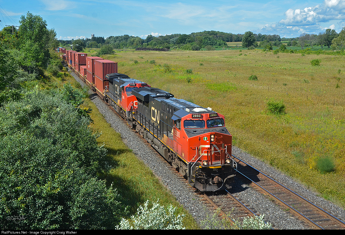 | Canadian National Railway intermodal train Q 10851 passes through Newtonville, Ontario, on August 25, 2019. CN ES44AC 2893 and Dash 8-40CW 2144 (ex-BNSF 818, nee-ATSF 818) are pulling this 10,237-foot train of 135 loads and 20 empties, weighing 8,754 tons, as it makes its way from Vancouver BC (Thornton Yard) to Montréal QC (Tashereau Yard). |