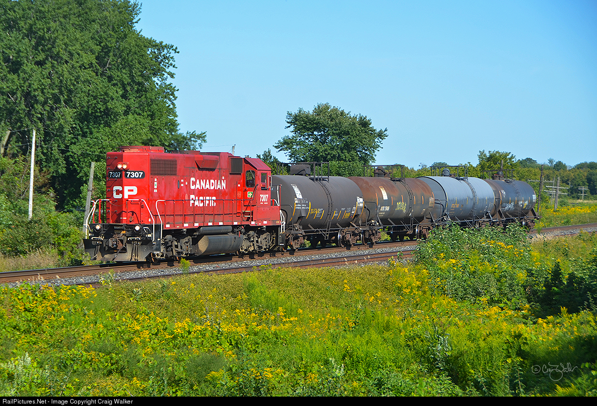 Canadian Pacific local T10 heads west through Lovkin, at milepost 155.6 on the Belleville Subdivision. CP GP38-2 7307 is returning to the yard in Oshawa, ON, with four tank cars. This locomotive is the former Delaware & Hudson 7307, ex-D&H 226, ex-D&H 7320, originally Lehigh Valley 320. In February 2003, 16½ years earlier, I photographed this engine in Albany, NY, painted in the then-current "Golden Beaver" scheme. (Newcastle, Ontario - August 25, 2019)