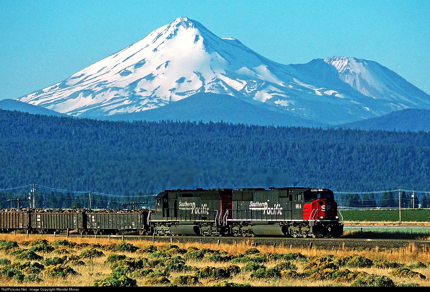 An eastbound manifest rolls through the Butte Valley, in the shadow of Mount Shasta. The Friendly Southern Pacific has just a little over a year of independence remaining.