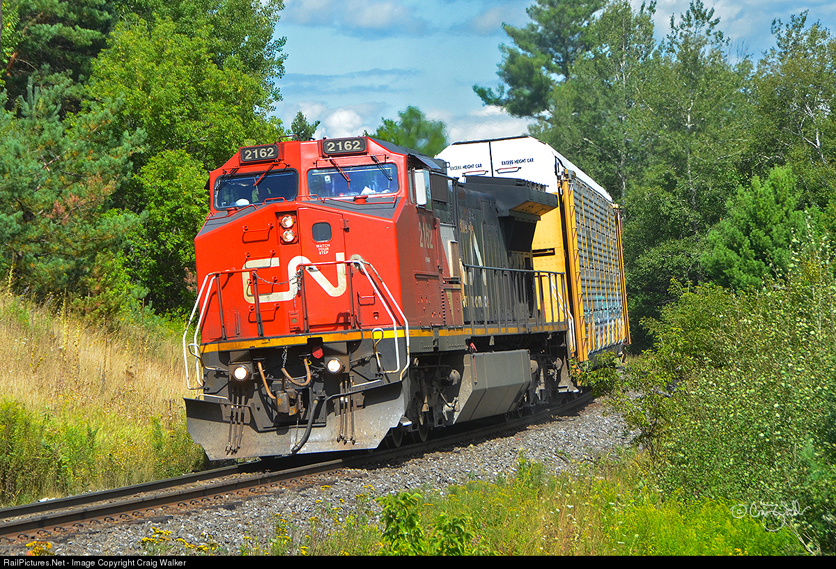 After sitting in 6623-foot Pefferlaw Siding (on the Bala Sub) for a couple of meets, Canadian National Railway train M 31841 (a long haul freight, consisting of all autoracks, heading from Symington Yard in Winnipeg, Manitoba, to MacMillan Yard in Toronto, Ontario) is on the move again as it rounds the curve in Cedar Valley, in Ontario's York Region. This train warrants just a single locomotive, Canadian National class EF-640g Dash 8-40CW 2162 (the former BNSF 801, originally Santa Fe 801). Click HERE to see CN 801 when it was a Santa Fe locomotive. (Cedar Valley, Ontario - August 30, 2019)