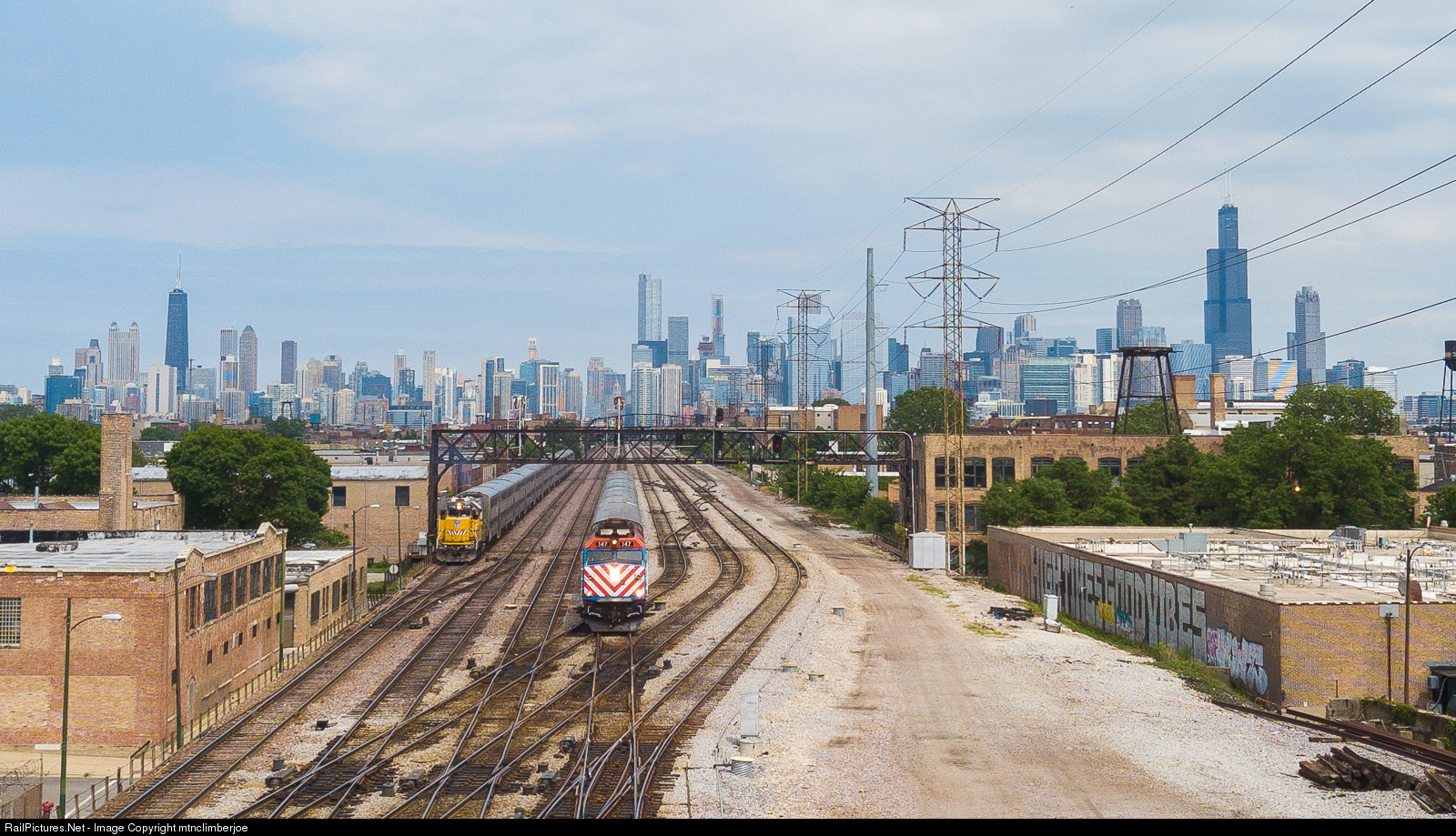 | The Chicago skyline spans the background as Metra 147 leads an outbound commuter train on the UP Geneva Sub, passing under the former CNW signal bridge at Tower A2. A UP GP15 makes a transfer move of Metra cars towards downtown. |