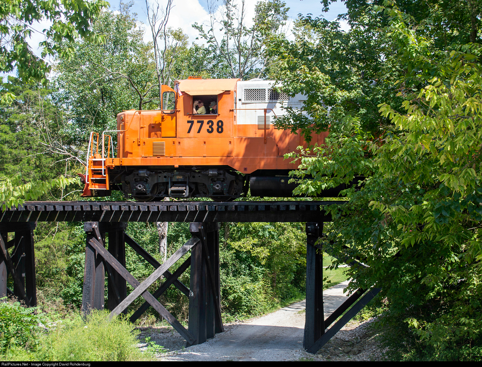 The Bluegrass Scenic Railroad and Museum's restored ICG GP8 7738 eases across a wooden trestle over a private drive near Tyrone, between Milner and Young's High Bridge on their portion of the former Southern Railway LL Branch.