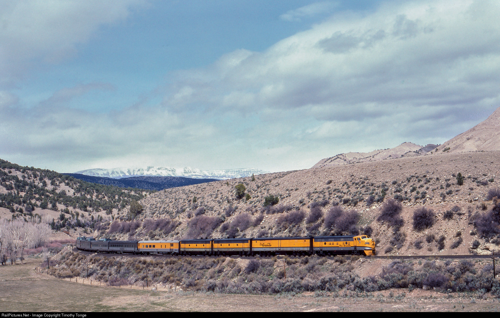 DRGW 5771 leads the westbound Rio Grande Zephyr, nearing Dotsero, CO, on Apr 2, 1983. In less than 3 weeks, the Rio Grande Zephyr would be no more.