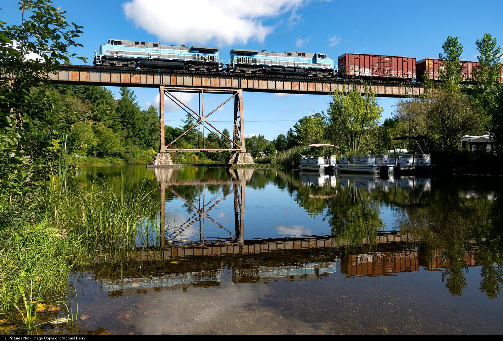 CMQ 1 with matching GE's CEFX 1002/CEFX 1006 and 66 cars is crossing the Eastman trestle on its way to Farnham Yard as the train is reflected in Lac d'Argent on a still morning.