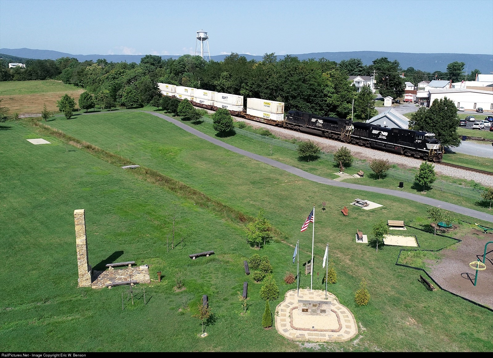 | NS train 202 approaches Stanley, VA while passing Ed Good Park. The memorial in the foreground was built to honor those families displaced from Shenandoah National Park. |