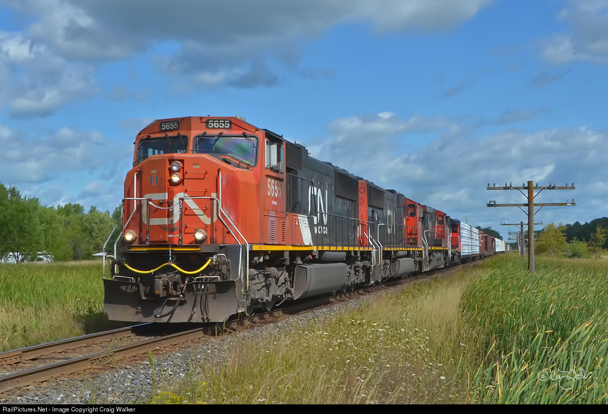 Canadian National Railway SD75I 5655, SD75I 5769, Dash 9-44CW 2583 and GP38-2 7508 bring train M 31441 through Georgina, in Ontario's York District. This freight train is heading to Toronto's MacMillan Yard (CN's second largest yard), having originated in Winnipeg's Symington Yard (CN's largest yard). (August 30, 2019)