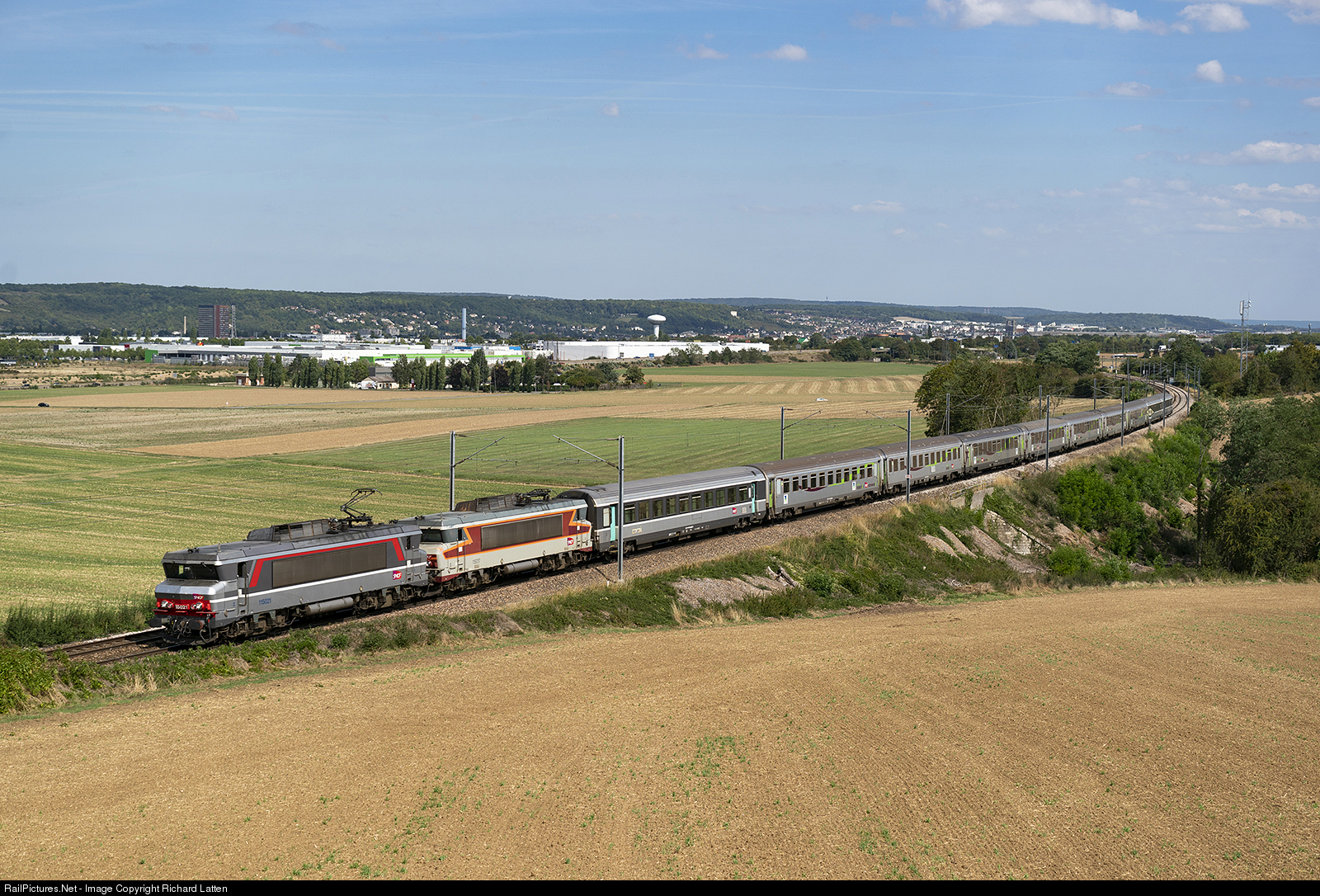 | SNCF BB 15021 in 'multiservice' livery hauling Intercités 3347 Paris-St. Lazare - Caen. Second in the train is BB 15017 in Grand confort livery. The picture was taken at Jouiy-Mauvoisin, with Mantes-la-Jolie in the background. |