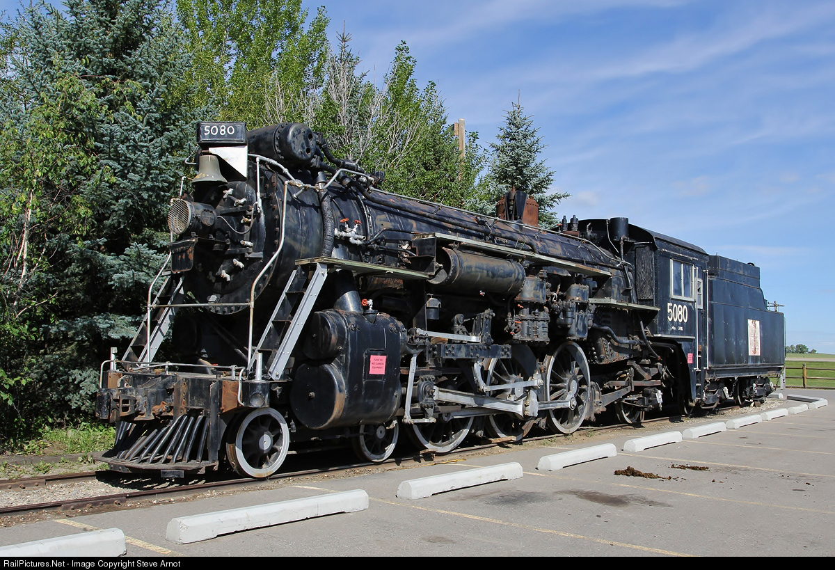 | Former CNR J-4-a class Pacific-type 4-6-2 #5080 at Aspen Crossing in Mossleigh, AB. This locomotive was recently relocated from Prince Albert, SK and is awaiting a planned restoration to running condition. |