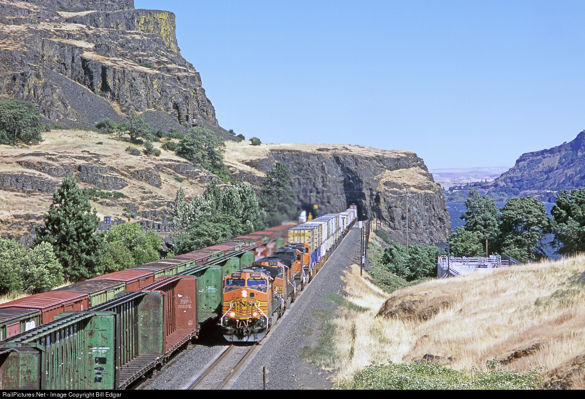 | BNSF 5408 leads a Z train west through Lyle, WA along the Columbia River en route to Portland, OR. The containers/trailers are loaded and active while many lumber center beams and boxcars remain stored in the sidings at Lyle during this period after the 2008 housing melt down. |