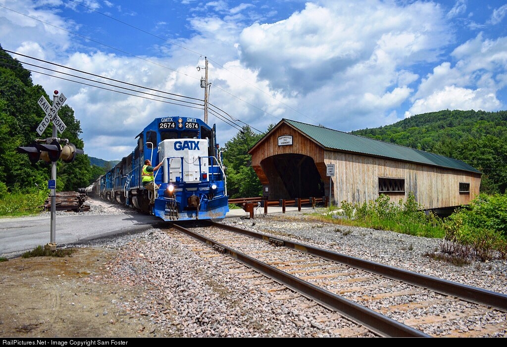 GMTX 2674 leads GMRC 263 east passed the old covered bridge in Bartonsville, VT.