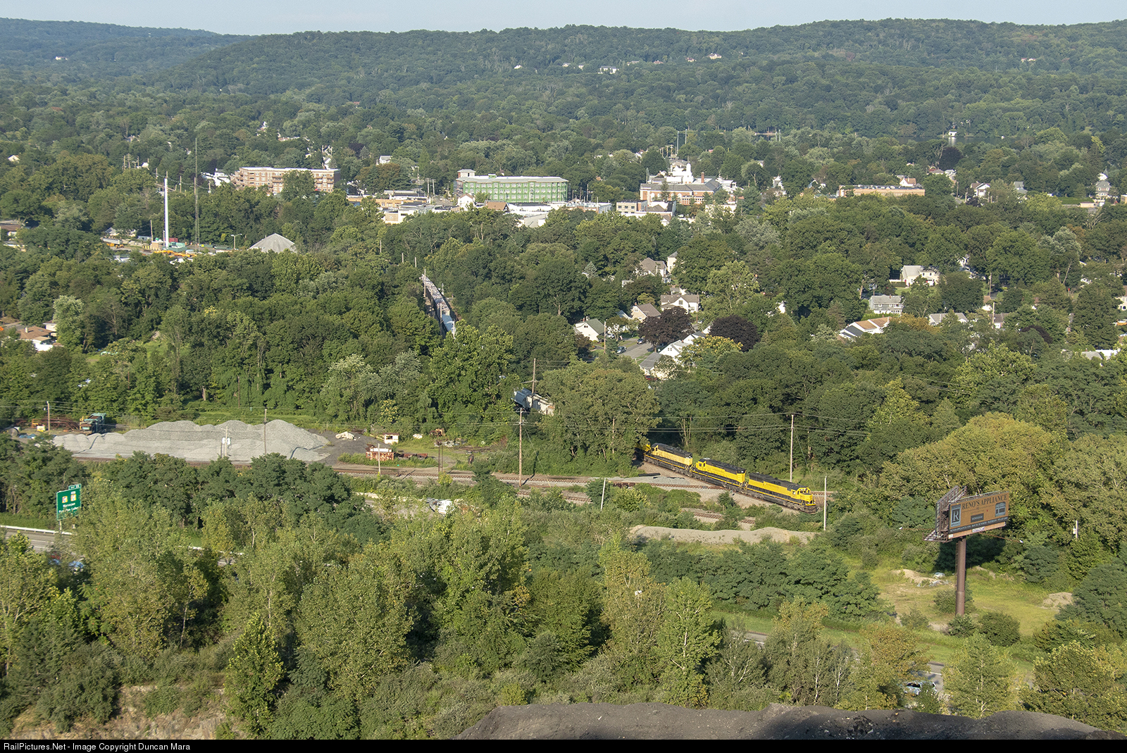 NYS&W SU-99 crossing Pompton Diamond in Pompton Lakes, viewed from the cliffs of Federal Hill in Blooomingdale, NJ. Various buildings of the downtown area can be seen in the background, including the historic 1932 built Pompton Lakes High School.