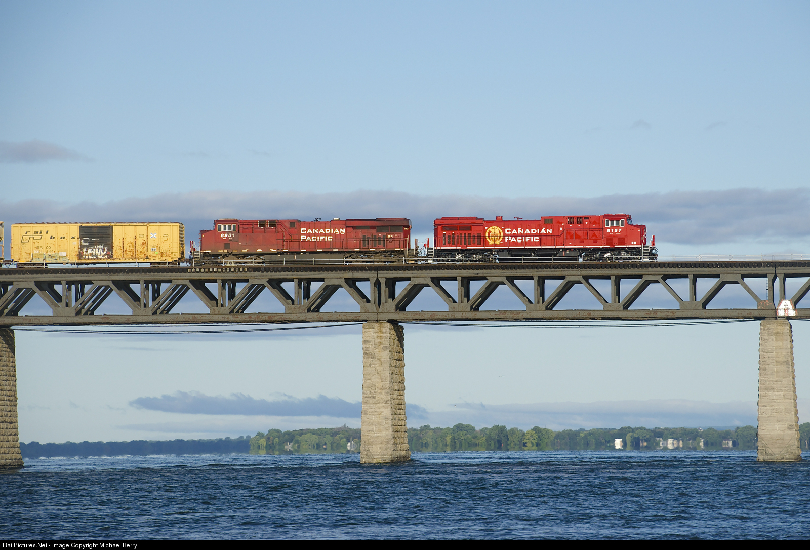 Fresh AC440CWM CP 8157 (rebuilt from CP 9646) and grimey CP 8931 lead CP 253 over the St. Lawrence River.