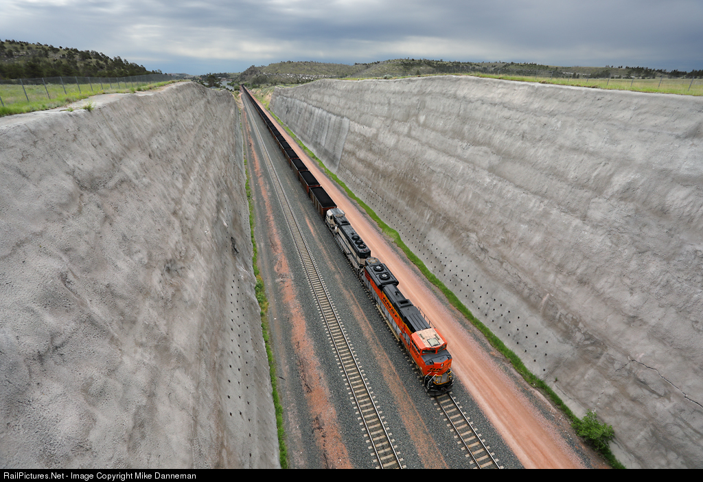 On June 21, 2019, an eastbound BNSF coal train passes through a massive cut at Stokes in a view from Skyline Drive overpass located in Wyoming’s Guernsey State Park. In the spring of 1998, BNSF daylighted Sunset Tunnel, also known as the 1,928-foot Tunnel 2 between Guernsey and Wendover. The wood-lined tunnel on this 9-mile segment of railroad was originally built by the CB&Q in 1915 and was one of three tunnels on the line. Besides the huge amount of work to remove the tunnel, BNSF also had to stabilize the soft earthen boundaries of the excavation with a concrete mixture sprayed to the sides of the cut, giving the scenery a strange new look. It also gave the railroad a lengthened Stokes siding to the east.
