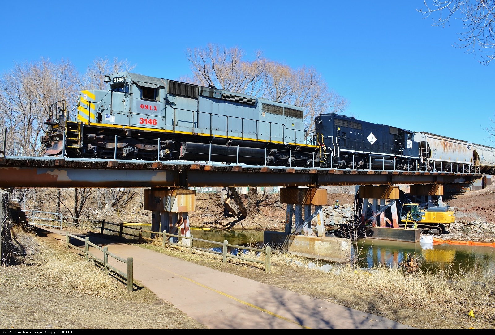 OmniTRAX's SD40-3 leads their newly repainted GP40-2L (former Canadian National) and a freight over the Cache la Poudre River in Fort Collins, Colorado.