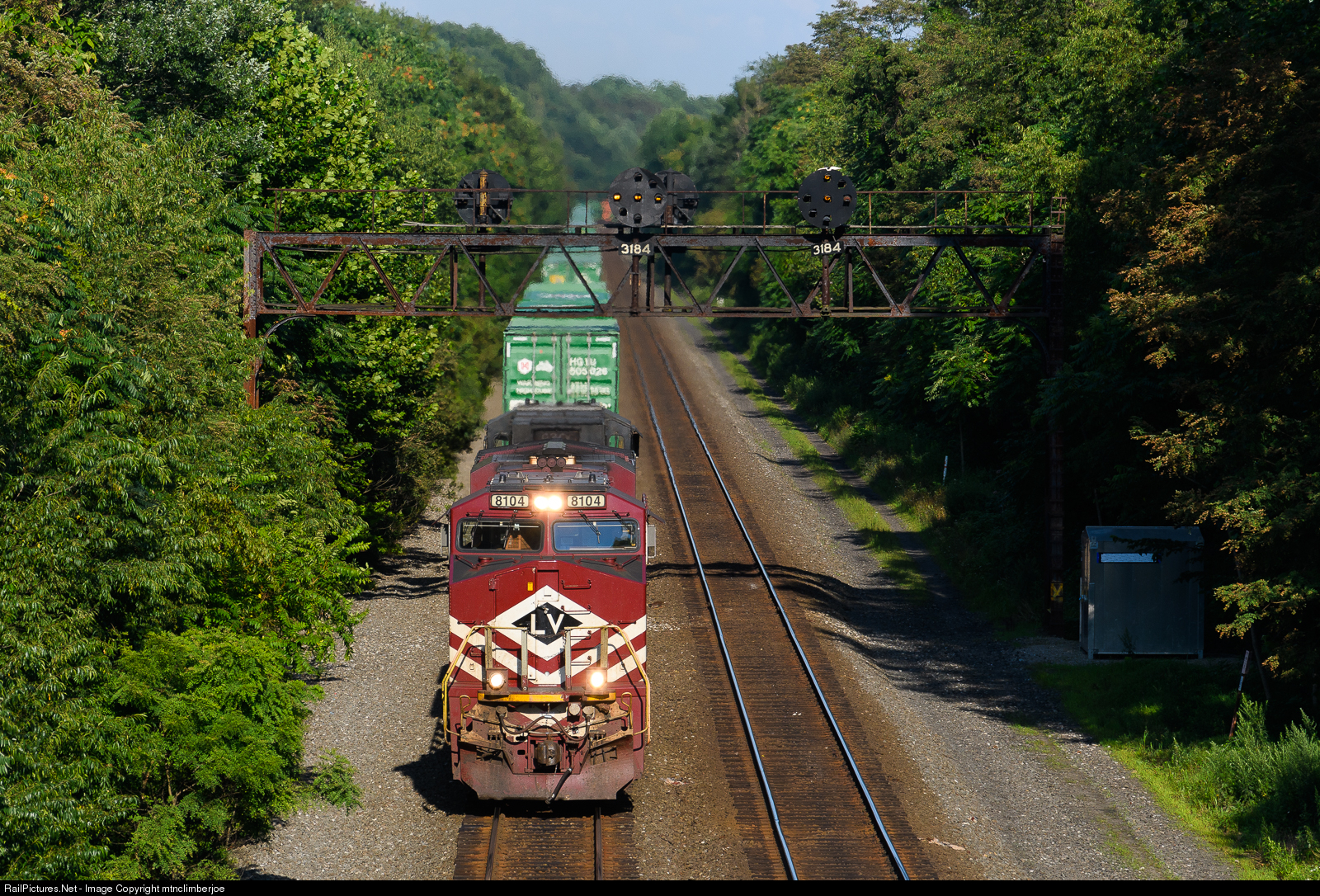 The Norfolk Southern Lehigh Valley heritage unit is on the point of westbound intermodal 23M as it passes under the PRR signal bridge in its final weeks of service at Georges Station.