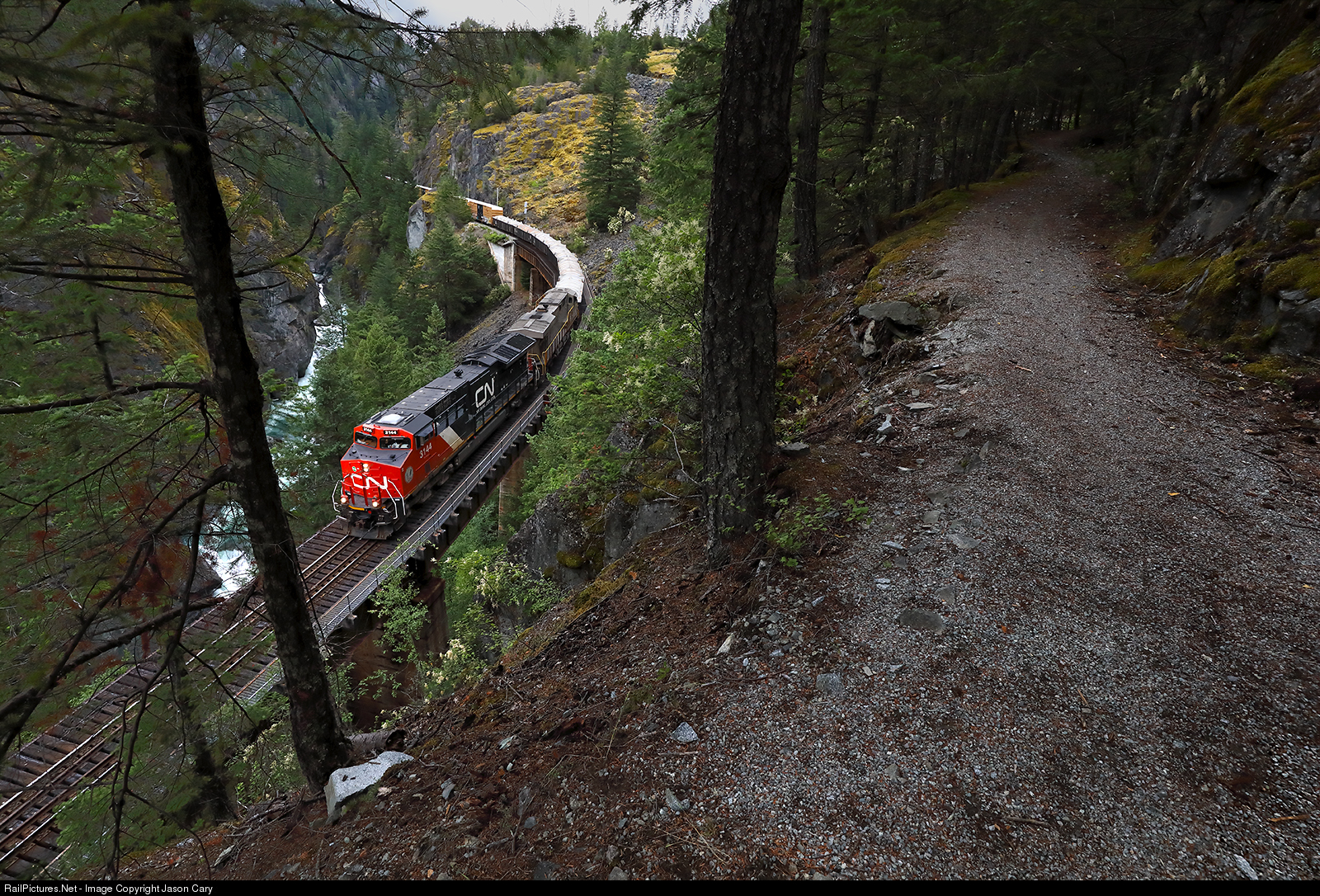 The New Road and the Old. In the 1870's a trail through the British Columbia Wilderness was constructed to offer ranchers a way to move cattle from the interior near Lillooet and Pemberton to the the seaport at Squamish. The trail was quite a accomplishment at the time, but as far as anyone knows only one herd of cattle was ever moved over the mountainous trail. The undulating terrain and conditions supposedly killed most of the herd before it ever made it to Squamish. The trail was mostly used by miners and lumbermen seeking fortune. Later it was used as a early road . Until the arrival of the railroad in 1912 it was the only way to Whistler. I can only imagine a Model T climbing this isolated and rural trail. The railroad arrived in 1912, and the road fell into disrepair as a 4x4 trail. Today the trail is part of the scenic Sea-To-Sky Trail. Deep in Cheakamus Canyon the old road follows the new road (the railroad). The Pacific Great Eastern built this spectacular railroad to open the British Columbia's interior to settlement and the extraction of natural resources. Train 570 lead by a new Tier IV GE drops downgrade on wet rail, across one of the many bridges in Cheakamus Canyon.