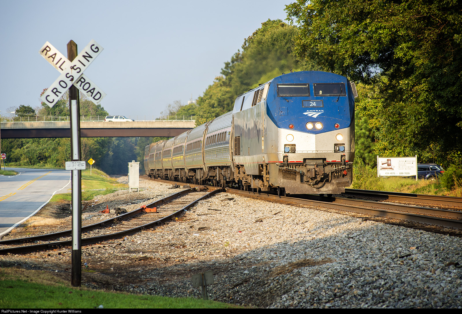 | Running about 20 minutes behind, Amtrak train 80 cruises uphill on its way north through Thomasville, NC on the sunny morning of September 13, 2019. |