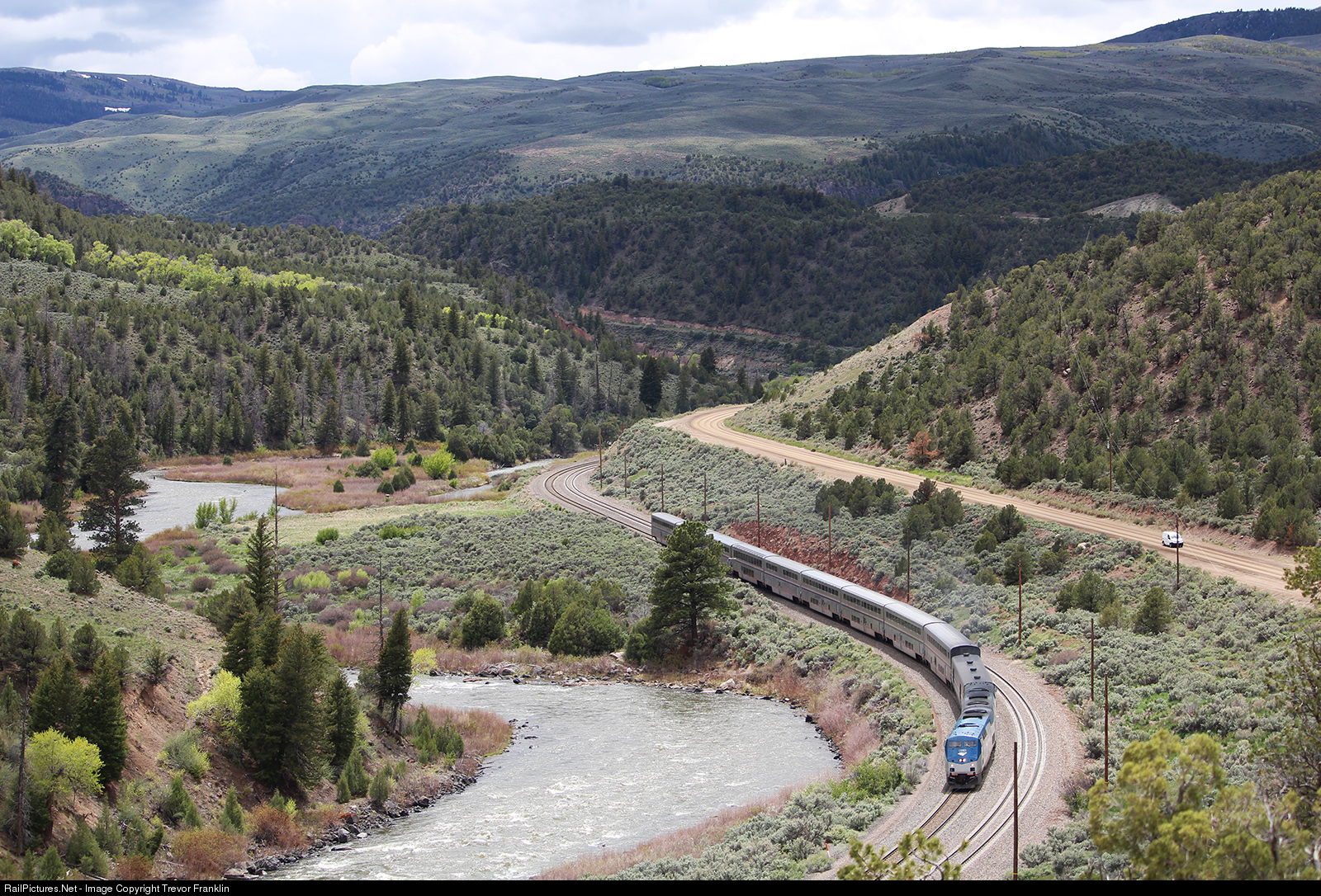 Amtrak's eastbound California Zephyr snakes along the Colorado River through Yarmony in Eagle County, CO as the sun pokes through the afternoon's rolling clouds.