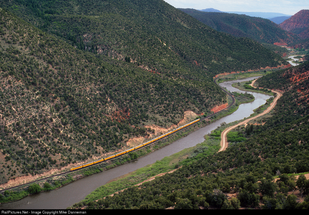 Powered by an A-B-A set of EMD E9s, a Union Pacific passenger train follows the Colorado River eastbound on UP’s Dotsero Cutoff between the sidings of Range and Dell west of Burns, Colorado, on June 6, 1998. This vista is from Road 39, the Derby Mesa Loop off of Colorado River Road.