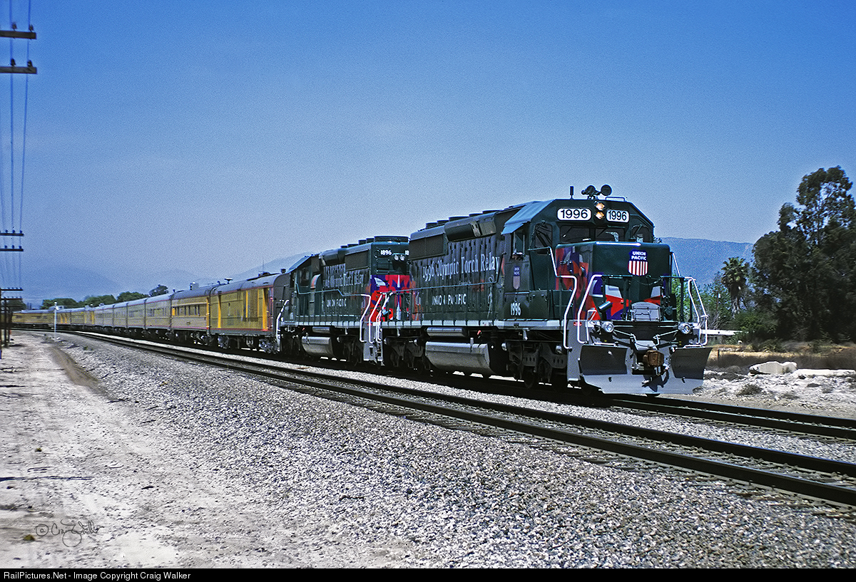 Union Pacific SD40-2s 1996 and 1896 take the Atlanta 1996 Olympic Torch Relay up Southern Pacific's "Sunset Route" through San Timoteo Canyon as the train heads east to, eventually, Atlanta, Georgia, for the 1996 Summer Olympic Games. The last car on this train is a specially built "cauldron car" which is equipped to carry the Olympic Flame between those segments in which runners are not carrying the flame on torches. (This would be repeated by the UP again in 2002 for the Winter Olympics in Salt Lake City, Utah.) This train will follow a circuitous route to get to Atlanta, as the Games are still months away and the Flame will be carried throughout much of the United States before arriving in Atlanta. (Redlands, California - April 28, 1996)