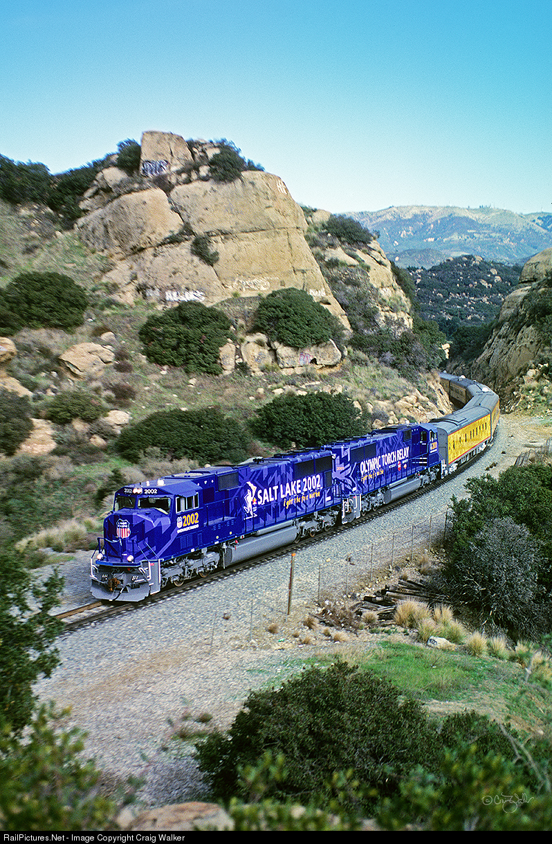 The Union Pacific's "Salt Lake 2002 Olympic Torch Relay" train passes through the Santa Susana Mountains on its way north on January 16, 2002. This train, carrying the Olympic Torch, is about to enter Tunnel 28 after passing through Chatsworth, California. Built by the Southern Pacific, this line is now owned by Metrolink, as their Ventura Subdivision. The "Salt Lake 2002 Olympic Torch Relay" train is taking a circuitous route to Salt Lake City, where the 2002 Winter Olympics will be held, in order to allow the Olympic Torch to traverse as much of America as possible. The train carries the Olympic Flame in a specially designed car on the end, which has a cauldron during the entire trip. At a variety of points, torches are lighted from this cauldron and carried by runners as they, and the flame, make their way to Utah.