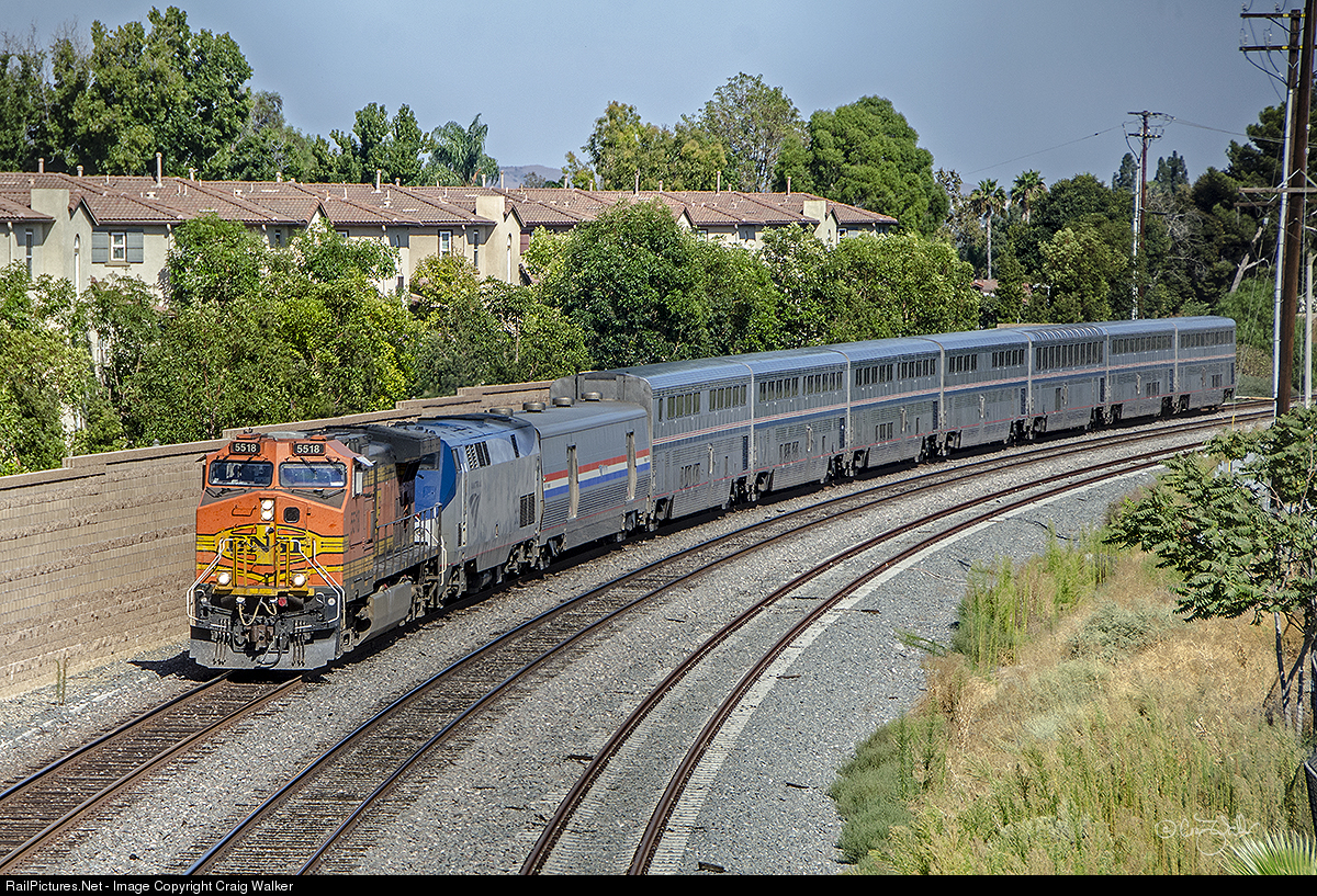 Yet another Amtrak number 3, the westbound Southwest Chief, with a tale of woe ... Amtrak 3 departed Chicago IL on September 12, 2019, behind P42DCs 164 and 199. After making its station stop in Albuquerque NM, the train hit a boulder on Main 2 at MP 66.7 (Laguna NM). Lead engine AMTK 164 was damaged and set out at Acomita NM. Amtrak P42DC 199 was able to make track speed (up to 90 mph) for the 220 miles as it pulled the 8-car Chief by itself to Winslow AZ, where BNSF Dash 9-44CW 5518 was added. The train was 8 hours 52 minutes late when photographed passing through Placentia, California, on September 14, 2019. Just 29 miles to go to get to Los Angeles!
