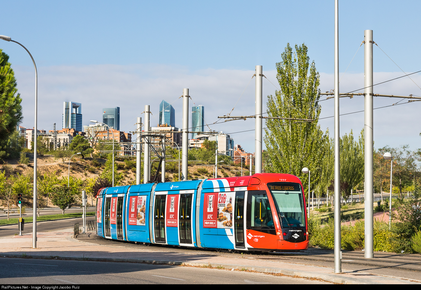 This Alstom Citadis tram is the Metro Ligero, the tramway of Madrid. The line ML-1, where this photo was taken, connects the stations of Pinar de ChamartÃn and Las Tablas. It is 5.4 km long (3.4 mi) and has nine stations, five of which underground.