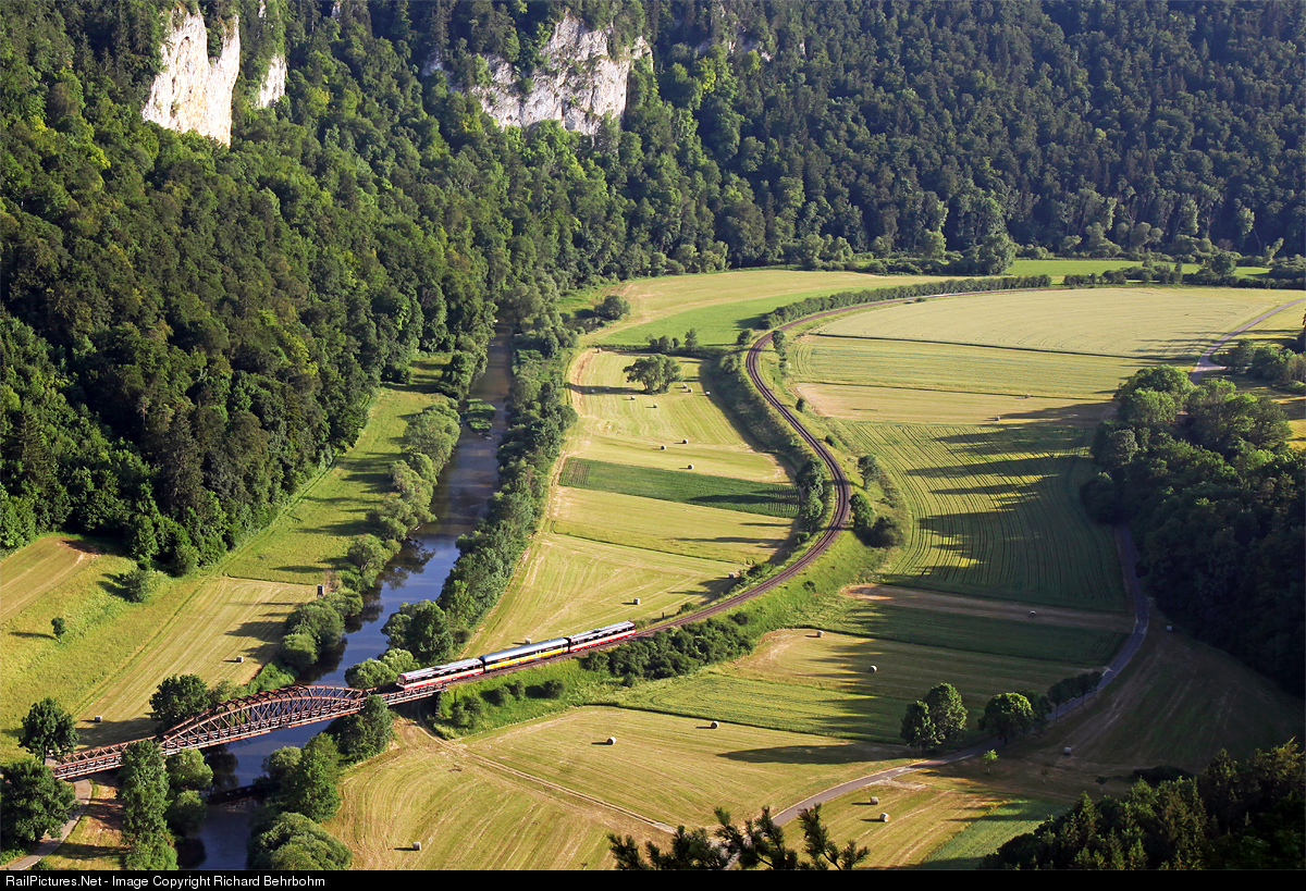 The NPE "Nature Park Express" Donaueschingen - Sigmaringen, here in the valley of the young river Danube, is running only during summer season. The baggage car in the middle of the train is for transport of bikes.