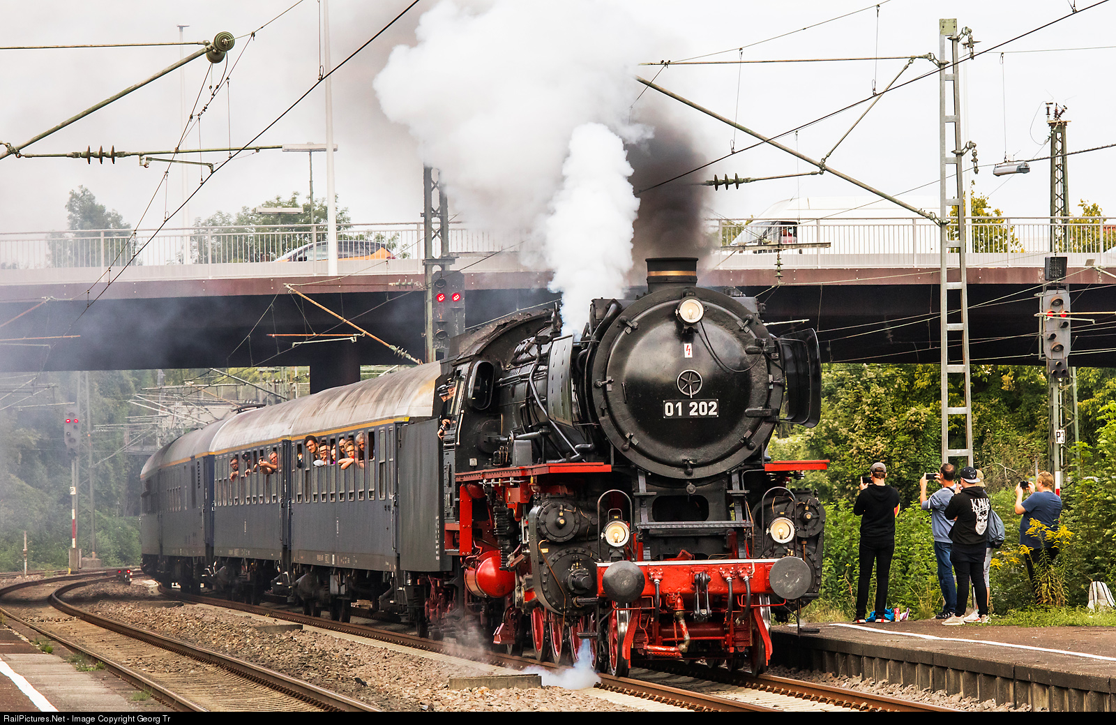 | Former Deutsche Bundesbahn 4-6-2 "Pacific" express train steamlocomotive 01 # 202 of association Pacific 01 202 in Lyss/Switzerland, is entering Göppingen with a special train from Stuttgart on the occasion of the 12th Märklin Days and the international modell railway exhibition. |