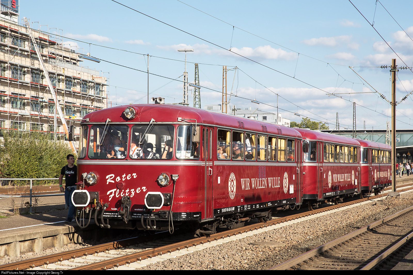 | "Schienenbuszug" (rail bus train) "Roter Flitzer" VT 798 # 469 with two trailers of the association "Förderverein Schienenbus e.V." in Kornwestheim, is leaving Göppingen for Pforzheim after a visit of the Märklin Days and international rail model exhibition. On the train is written "Wir wollen Wulle" which means "We want Wulle beer", a traditional beer of the region, founded in 1832. More them 300 of this diesel rail buses "VT 98" were built from about 1955 to 1962 for branch line services and were very popular. |