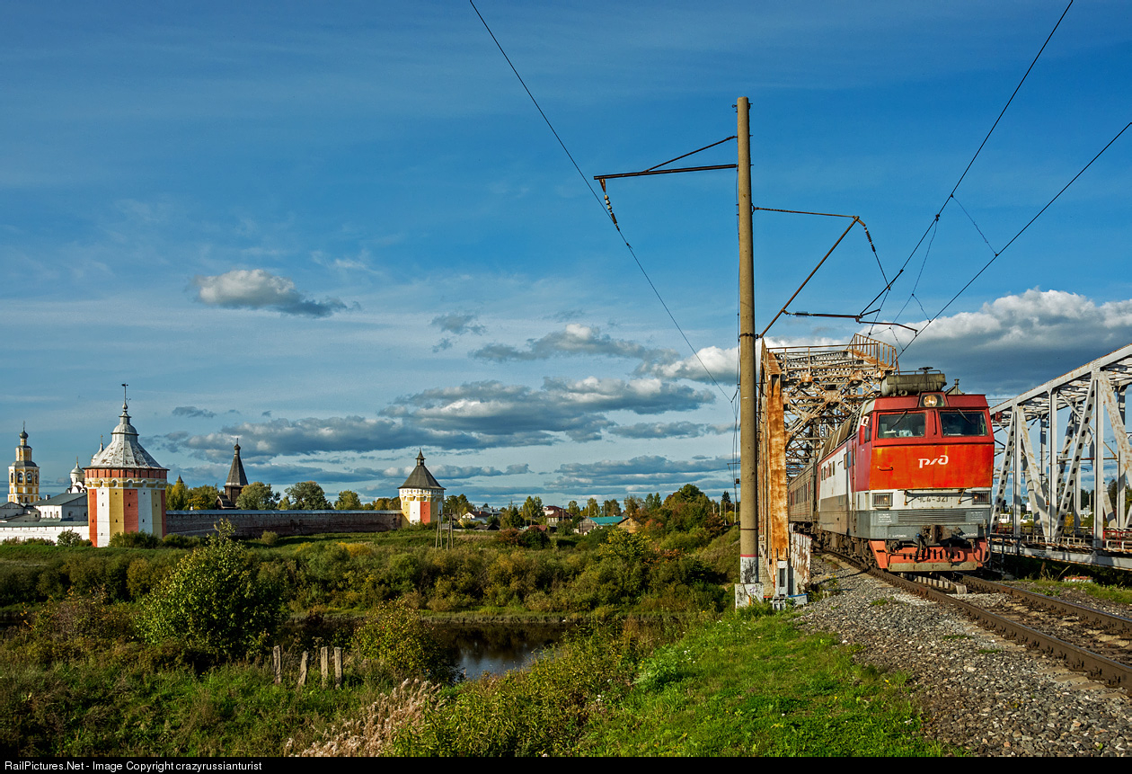 | An electric locomotive ChS4T-321 with an additional passenger train No. 569 Syktyvkar - Rostov will follow the bridge over the Vologda River, on the left there is a picturesque view of the monastery wall and towers of the Spaso-Prilutsky Dimitri Monastery, which is one of the business cards for guests of the city of Vologda |