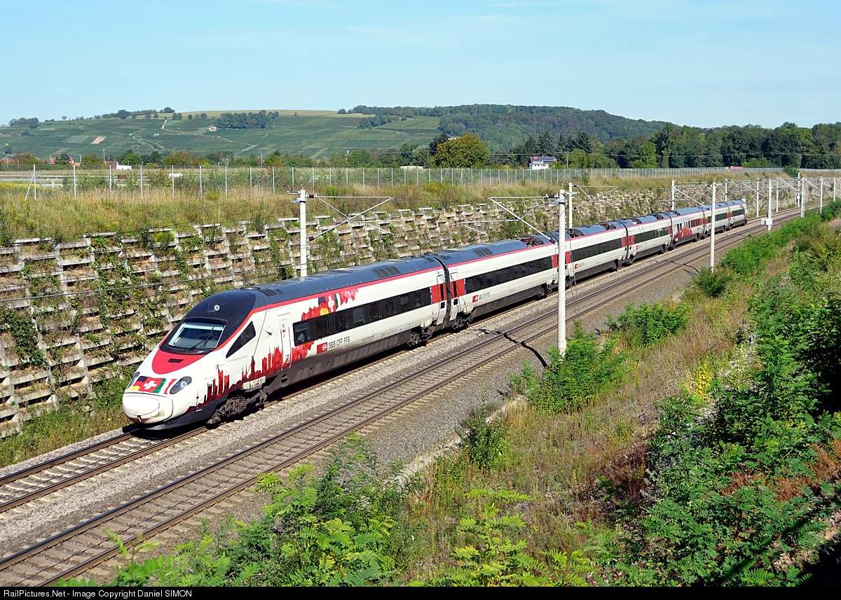 | The Swiss EMU #503 022 (named after the German writer and poet Johann Wolfgang von Goethe) has extra stickers promoting the EuroCity-Express (ECE) service Frankfurt a/M – Milan, that has started on 10.12.2017. The unit has stickers showing silhouettes of famous buildings in cities along the way on both its end cars and the Restaurant car. Also the flags of Germany, Italy and Switzerland are integrated in the design. The service Frankfurt a/M – Milan is direct service via Basel, Luzern and Lugano (via the Gotthard Base Tunnel). |
